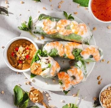 Servi: Gli involtini vanno serviti immediatamente o coperti con un panno umido per evitare che la carta di riso si secchi e si indurisca. Servili con la salsa Nuoc Cham a lato per intingere.