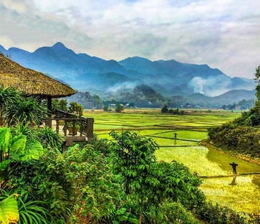 La Valle di Mai Châu, incastonata tra le maestose montagne calcaree a circa tre ore e mezza di auto da Hanoi, è un rifugio rurale che regala un'immediata e profonda sensazione di pace. Lontana dalla frenesia della capitale, questa valle lussureggiante è la patria delle laboriose comunità Thai Bianche (Tài Đón) e offre un'immersione completa nelle loro tradizioni secolari, in un paesaggio idilliaco dove le risaie definiscono l'orizzonte.